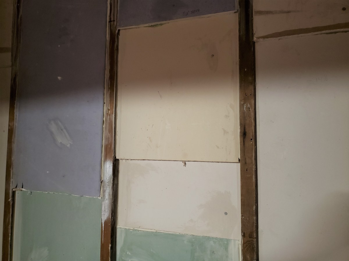 Figure showing our attempt to block low-frequency sound by building bunker: we packed the stud cavities with layers of sheetrock (left), added ceiling with layers of Hardie panel and mass-weighted vinyl, added layers of Hardy panel to exterior, and built custom door with three layers of mass-weighted vinyl sandwiched between solid wood – maybe it blocked zero to 2 decibels of low-frequency sound (see noise graphs above).